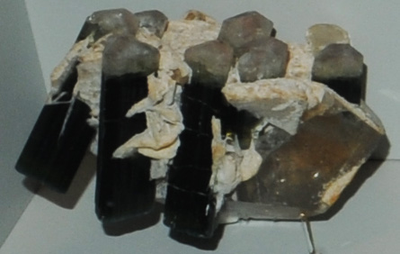 These samples of elbaite are on display in the Smithsonian Museum of Natural History. Elbaite is assigned the general formula Na(Li,Al)3Al6(BO3)3- Si6O18(OH)4. This sample is from Brazil and is described as elbaite with albite. It is a silicate which has lithium content, lithium being a rather rare element. It also contains boron This sample is about 10cm across.