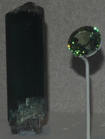 Above left is an elbaite column of variety indicolite from Mt. Mica, Paris, Maine along with a 21.1 carat gem. The column is about 1.5x6cm. Center is a 30.4 carat elbaite gem from Nevel gem pit, Newry, Maine. At right above is a 20.4 carat gem from Madagascar.