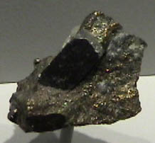 This sample of glaucodot is displayed in the Smithsonian Museum of Natural History. Glaucodot is a sulfide mineral of cobalt, iron and arsenic with the composition (Co,Fe)AsS. The sample is about 4x4 cm and is from Tunaberg, Sweden.