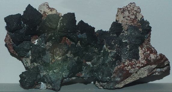 Mn3O4This sample of hausmannite is displayed in the Smithsonian Museum of Natural History. Hausmannite is an oxide mineral of manganese with the composition Mn3O4. This sample is about 14x7 cm and it is from N'Chwaning mine, Cape Province, South Africa . It is described as hausmannite with spessartine. |