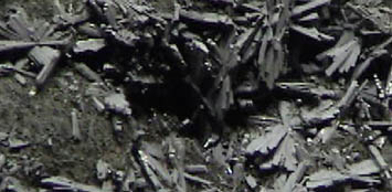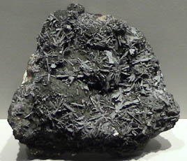 This sample of hutchinsonite is displayed in the Smithsonian Museum of Natural History. Hutchinsonite is a sulfide mineral of thallium, lead and arsenic with the composition (Tl, Pb)2As5S9. The sample is about 12x12 cm and is from Henderson mine #2, Quiruvilea, La Libertad, Peru.