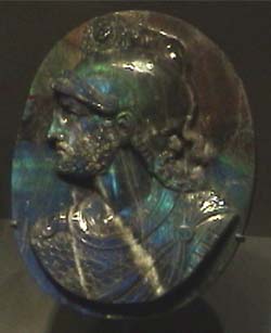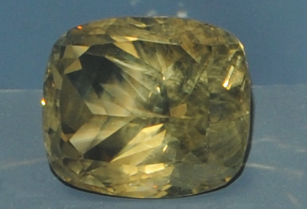 This labradorite gem is labeled as 258.2 carats. It is on the order of 5 cm across. It is from La mina de la Piedra del Dol Dorado, Chihuahua, Mexico.