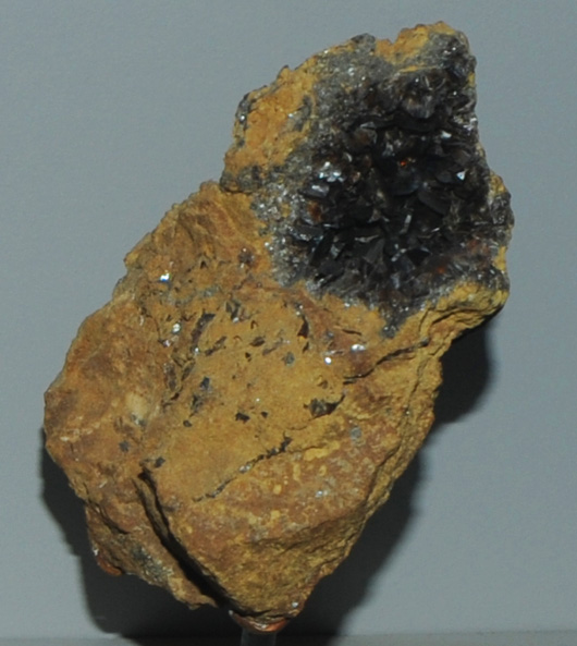 This sample of nadorite is displayed in the Smithsonian Museum of Natural History. Nadorite is a chloride of lead and antimony with the composition PbSbO2Cl. The sample at left is about 4 cm across and is from Djebel Nador, Constantine, Algeria.