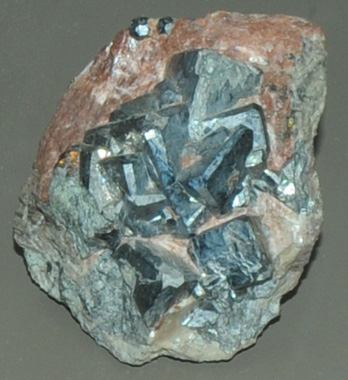 This sample of nickel-skutterudite is displayed in the Smithsonian Museum of Natural History. Nickel-skutterudite is an arsenide of nickel with the composition NiAs2-3. The sample at left is about 6 cm across and is from Schneeberg, Sachsen, Germany.