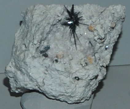 This sample of pseudobrookite is displayed in the Smithsonian Museum of Natural History. Pseudobrookite is an oxide mineral of titanium along with iron with the composition Fe2TiO5 . This sample is about 5x5 cm overall with the crystalline form about a centimeter in dimension. It is from Thomas Range, Utah.