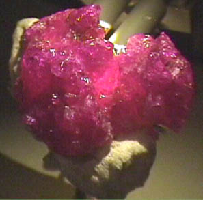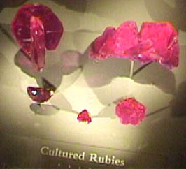 These are man-made or "cultured" rubies. All the samples are on display at the Museum of Natural History. Ruby is made up of the mineral corundum, which is aluminum oxide (alumina, Al2O3). It becomes the precious stone when it has a a small impurity of chromic oxide which gives it the rich red color. If the corundum has other impurities to give it other colors, it is called sapphire.