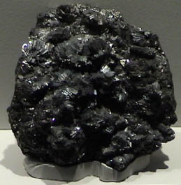 This sample of semseyite is displayed in the Smithsonian Museum of Natural History. Semseyite is an sulfide mineral of lead and antimony with the composition Pb9Sb8S21 . This sample is about 9x9 cm and is from Herja, Transylvania, Romania.