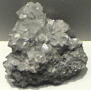 This sample of senarmontite is displayed in the Smithsonian Museum of Natural History. Senarmontite is an oxide mineral of antimony with the composition Sb2O3 . This sample is about 11x10 cm and is from Qacentina, Algeria.