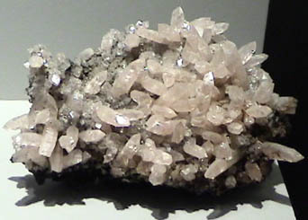 The colors of the zinc carbonate mineral range through the spectrum from green to pink. The pink sample above is about 13x13 cm in size, wheras the slender white spears at right are around a half centimeter in diameter.