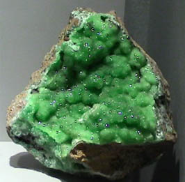 This sample of at left above is about 4x10 cm and has the appearance of stalagmites. The green sample on the right is about 11x13 cm in size.
