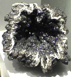 This sample of sphalerite is displayed in the Smithsonian Museum of Natural History. Sphalerite is an sulfide mineral of zinc with the composition ZnS. This sample is about 12X12 cm and is from Nenthead district, Cumbria, England. Sphalerite is the most common ore of zinc. It has been called blende and zinc blende.