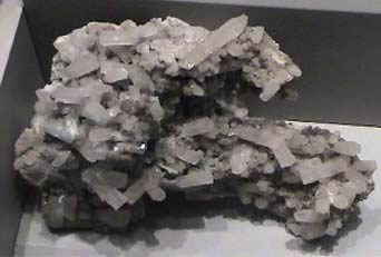 Strontianite is a carbonate mineral of strontium. It has the composition SrCO3. The origin of this sample is Drensteinfurt, Nord, Rhein-Westphalen, Germany. The sample measures about 9 cm across. All these samples are on display in the Smithsonian Museum of Natural History.