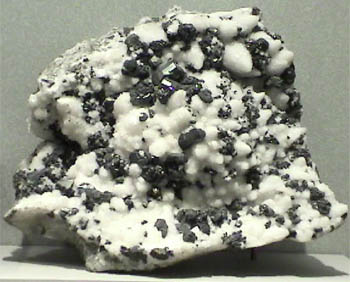 This sample of tennantite-tetrahedrite is displayed in the Smithsonian Museum of Natural History. Tennantite is a sulfide mineral of copper, iron, arsenic and antimony with the composition (Cu,Fe)12(As,Sb)4S13 . This sample is about 20x18 cm and is from El Cobre, Chihuahua, Mexico . This sample is formed with quartz and tetrahedrite.