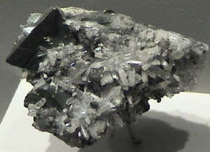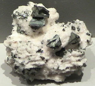This sample of tetrahedrite is displayed in the Smithsonian Museum of Natural History. Tetrahedrite is an sulfide mineral of antimony, copper and iron with the composition (Cu,Fe)12Sb4S13 . This sample is about 5x6 cm and is from Park City, Utah.