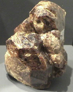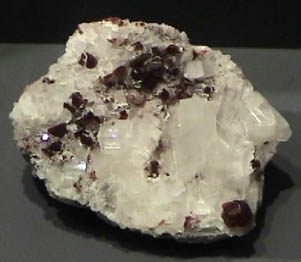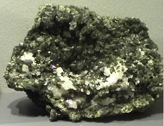 Uvite is a silicate which contains boron and magnesium with composition Ca(Mg,Fe)3Al5Mg(BO3)3Si6O18(OH)4. This sample is about 8x8 cm and is from Brumado, Bahia, Brazil. It is described as uvite with magnesite. It is on display at the Smithsonian Museum of Natural History.