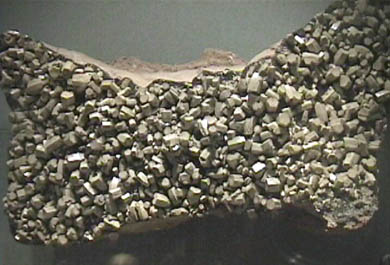 This collection of crystals is described as vanadinite with mottranite. The vanadinite has the composition Pb3(VO4)Cl , with the unusual contents of lead and vanadium. Its source is the Touissit Mine in Touisset, Morocco. It is on display in the Smithsonian Museum of Natural History. The sample measures 30-40 cm across.