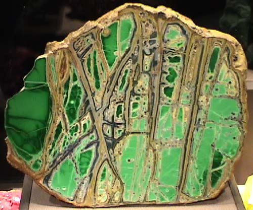 Variscite![]() Variscite is an phosphate mineral of aluminum with the composition AlPO4.2H2O . This sample is from the Fairfield, Utah. It is on display in the Smithsonian Museum of Natural History. The sample measures about 20x20 cm. Variscite's apple green color comes from traces of chromium. It is popular for carvings and ornamental stones. The yellow veins contain crandallite, wardite, and other phosphate minerals.