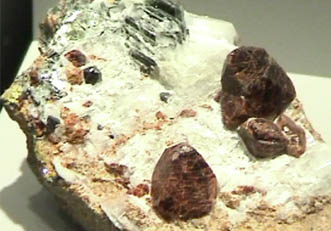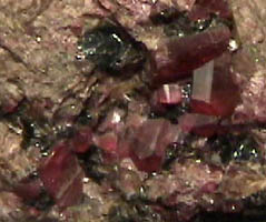 Chondrodite is a silicate with the composition (Mg,Fe)5(SiO4)2(F,OH)2. This sample is about 7x9 cm and is from Tilly Foster mine, Brewster, New York. The red crystals are about a cm in size.