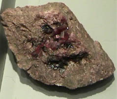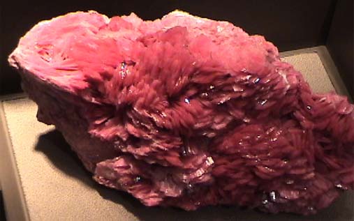 This sample of rhodonite is on display at the Smithsonian Museum of Natural History. The sample size is about 15x9 cm.