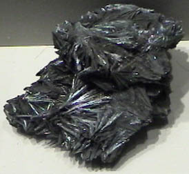 This sample of zinkenite is displayed in the Smithsonian Museum of Natural History. Zinkenite is an sulfide mineral of lead and antimony with the composition Pb9Sb22S42 . This sample is about 6x6 cm and is from Huanchaca, Potosi, Bolivia.