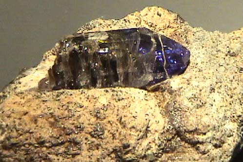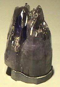 Zoisite![]() Zoisite is a silicate of calcium and aluminum with the composition Ca2Al3(Si3O7)(SiO4)(O,OH)2 . The sample above is about 5x5 cm with the crystal having dimension about 3x1 cm. It is from Arusha, Tanzania. These samples are identified as the variety tanzanite and are on display at the Smithsonian Museum of Natural History.