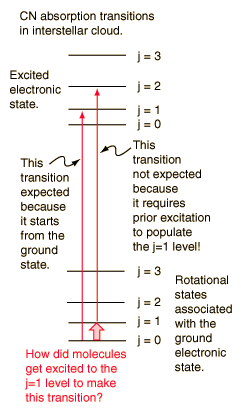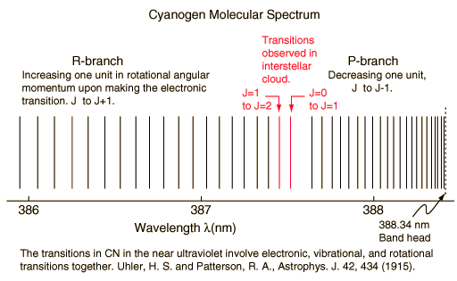 About measurements made in the early 40's, Rohlf quotes the noted molecular spectroscopist Gerhard Herzberg as saying "From the intensity ratio of the [CN] lines with [j=0 and j=1] a rotational temperature of 2.3 K follows, which has of course a very restricted meaning." It was not as restricted as he thought -- 25 years later, Penzias and Wilson would demonstrate the existence of the cosmic background radiation at 2.7K, an accomplishment for which they received the Nobel Prize. These early spectroscopists had seen evidence of the cosmic background radiation in the relative intensities of observed spectral lines! |