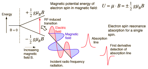 Electron Spin ResonanceWhen the molecules of a solid exhibit paramagnetism as a result of unpaired electron spins, transitions can be induced between spin states by applying a magnetic field and then supplying electromagnetic energy, usually in the microwave range of frequencies. The resulting absorption spectra are described as electron spin resonance (ESR) or electron paramagnetic resonance (EPR). Electron spin resonance has been used as an investigative tool for the study of radicals formed in solid materials, since the radicals typically produce an unpaired spin on the molecule from which an electron is removed. Particularly fruitful has been the study of the ESR spectra of radicals produced as radiation damage from ionizing radiation. Study of the radicals produced by such radiation gives information about the locations and mechanisms of radiation damage. The interaction of an external magnetic field with an electron spin depends upon the magnetic moment associated with the spin, and the nature of an isolated electron spin is such that two and only two orientations are possible. The application of the magnetic field then provides a magnetic potential energy which splits the spin states by an amount proportional to the magnetic field (Zeeman effect), and then radio frequency radiation of the appropriate frequency can cause a transition from one spin state to the other. The energy associated with the transition is expressed in terms of the applied magnetic field B, the electron spin g-factor g, and the constant mB which is called the Bohr magneton. ![]() If the radio frequency excitation was supplied by a klystron at 20 GHz, the magnetic field required for resonance would be 0.71 Tesla, a sizable magnetic field typically supplied by a large laboratory magnet. If you were always dealing with systems with a single spin like this example, then ESR would always consist of just one line, and would have little value as an investigative tool, but several factors influence the effective value of g in different settings. Much of the information obtainable from ESR comes from the splittings caused by interactions with nuclear spins in the vicinity of the unpaired spin, splittings called nuclear hyperfine structure.