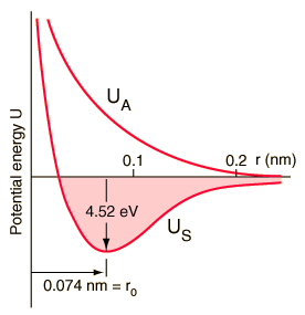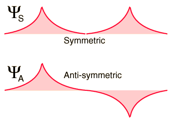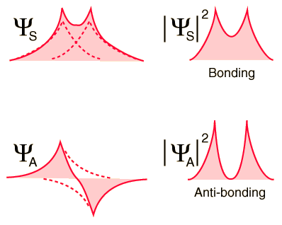 Hydrogen MoleculeThe classic case of covalent bonding, the hydrogen molecule forms by the overlap of the wavefunctions of the electrons of the respective hydrogen atoms in an interaction which is characterized as an exchange interaction. The character of this bond is entirely different from the ionic bond which forms with sodium chloride, NaCl. If you measure then energy balance when you form H+ and H- ions and examine the attractive force between them, the energy required is positive for any value of ion separation. That is, there is no distance at which there is a net attractive interaction, so the bond cannot be ionic. The electron distribution around the protons of the hydrogen is described by a quantum mechanical wavefuntion, and the wavefunction which describes the two electrons for a pair of atoms can be symmetric or antisymmetric with respect to exchange of the identical electrons. From the Pauli exclusion principle, we know that the wavefunctions for two identical fermions must be antisymmetric. The electron spin part of the wavefunction can be symmetric (parallel spins) or antisymmetric (opposite spins), but then the space part of the wavefunction must be the opposite. That gaurantees that the entire wavefunction (the product of the spin and space wavefunctions) is antisymmetric. The two possibilities for the spatial wavefunctions for distant hydrogens are shown below. ![]() As shown below, when the hydrogen atoms are brought close together the symmetric spatial wavefunction leads to a bonding configuration of electrons and the antisymmetric one does not. The actual electron charge density is given by the square of the magnitude of the wavefunction, and it can be seen that the symmetric wavefunction gives a high electron density between the nuclei, leading to a net attractive force between the atoms (a bond). ![]()