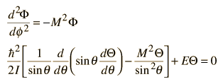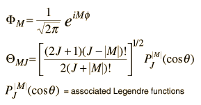 Energy Calculation for Rigid Rotor MoleculesIn many cases the molecular rotation spectra of molecules can be described successfully with the assumption that they rotate as rigid rotors. In these cases the energies can be modeled in a manner parallel to the classical description of the rotational kinetic energy of a rigid object. From these descriptions, structural information can be obtained (bond lengths and angles). The most straightforward examples are those of diatomic molecules. Energy calculations in quantum mechanics involve the solution of the Schrodinger equation with a properly formulated Hamiltonian to represent the energy operator. The form of the Hamiltonian can often be implied from the nature of the classical energy of such a physical system. The process involves finding the quantum mechanical operators associated with the constituents of the system energy. The energy of a freely rotating rigid rotor is simply the rotational kinetic energy, which can be expressed in terms of the angular momentum. The general form of operators associated with momenta are: ![]() Since the rotational kinetic energy of the rigid rotor can be expressed in terms of the angular momentum, we can imply the form for the Hamiltonian associated with the rotation around a single principal axis. ![]() For this limited case of rotation about a single axis, the Schrodinger equation can be formulated in terms of the total angular momentum and the form of the energy eigenvalues implied. ![]() To treat the more general three-dimensional rotation of a rigid molecule, it is necessary to formulate the Hamiltonian in three dimensions. It is appropriate to formulate it in spherical polar coordinates, and this adds significantly to the mathematical complexity. The square of the angular momentum operator takes the form of a Laplacian and the Schrodinger equation takes the form ![]() This form of the angular momentum contribution is also encountered in the solution of the Schrodinger equation for the hydrogen atom. The approach to the solution of this differential equation is to separate the variables in the form ![]() Substitution into the Schrodinger equation gives the two separated equations ![]() where M is inserted as an arbitrary "separation constant" at this point, but will be found to represent MJ, the z-component of the angular momentum. Solutions to these equations which meet the necessary constraints on the wavefunction, i.e. single valued and normalizable, can be obtained only when ![]() where J is a positive integer and M is an integer such that the absolute value of M is less than or equal to J. The wavefunctions associated with these allowed solutions are ![]()