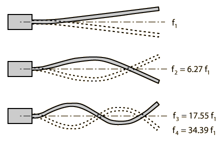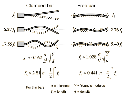 Clamped Bar ModesThe frequency f1 depends upon the density and elasticity of the material from which the bars are made. The amplitudes for the f2 and f3 modes would actually be much smaller than the fundamental. These mode frequencies appear with a tuning fork since it can be considered to be two clamped bars. ![]()