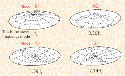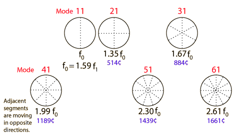Circular Membrane ModesThe four lowest vibrational modes for a circular membrane. ![]() Mode 11 is the lowest of the preferred modes for the timpani. |