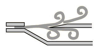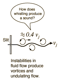 The pressure created by this interaction with the edge feeds back to the area of the slit, tending to push the stream upward. The reverse happens when the stream moves to the top side of the edge and then the process repeats itself. As a result, a periodic flipping of the airstream from side to side can produce a sound called an edge tone. More efficient edge tone instruments can be created by coupling a slit, an edge, and an air column. When such an instrument has been produced, the frequency is determined primarily by the air column resonant frequencies which will control the rate of oscillation of the air across the edge. The edgetone effect in such an instrument serves to help initiate and sustain the tone, and can help make the transition to a higher harmonic of the air column. The difference between the "edgetone" as envisioned in the sounding of a flute, recorder, organ pipe, etc. and the tones produced by directing air over an edge which is not coupled to an air column has been a subject of considerable discussion and investigation. Benade comments "Until recently there has been a tendency ... to confuse the sounds produced by blowing a narrow air jet against a sharp edge when the edge forms part of a flute or an organ pipe (air reed behavior) with those produced when the system is run in isolation (edge-tone behavior). In the latter case a type of repetitive eddying called vortex shedding takes place on alternate sides of the air jet, and a sound is produced if a sharp edge is used to separate the two sets of vortices. Vortex phenomena have only a secondary influence on flute-type sound production; moreover, at ordinary musical blowing pressures the edge-tone frequencies are so high as to be nearly inaudible. Some of the literature which addresses the differences between the free edgetones and the behavior of the edges in flutes and organ pipes: