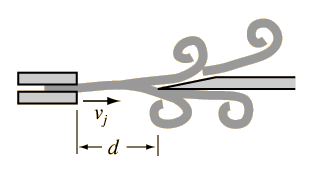 This regime, referred to as Region I of the edgetone behavior, is the main operating mode for organ pipes and presumably also for the flute. Note that the pitch can be made to go up by either increasing the airstream velocity, or by decreasing the distance from the slit to the edge (both applicable to playing the flute). Because of the feedback mechanism to the slit, the effective diameter of the edge does not figure directly in this pitch relationship as it does in the case of aeolian tones.