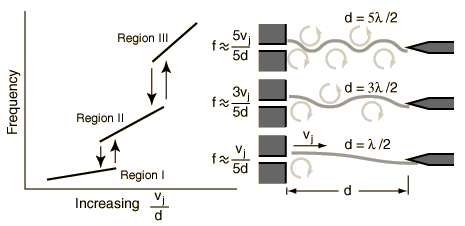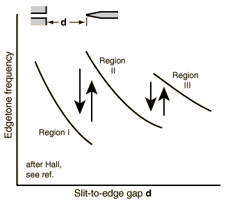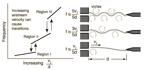 Increasing Airstream VelocityFor a given distance between a slit and an edge, the edgetone frequency increases with airstream velocity, but may break up or down to a different region with changes in the airstream velocity. At a given airstream velocity, a fairly stable tone may be maintained, attributable to a feedback mechanism. ![]()