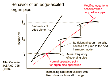 ![]() The air column resonance of an organ pipe will tend to alter the free edge tone to match the resonant frequency of the pipe. It is typical for the edge-excited organ pipe to produce the fundamental frequency of the pipe. But considerable effort in design must be spent to make sure that is so. The position of the slit relative to the edge and the distance from the slit to the edge must be chosen so that the fundamental pitch is stable at the airstream velocities produced by the wind chest of the organ. If the airstream velocity is increased, the pipe can go sharp, or even jump to the next harmonic of the pipe. It is common to hear this jump due to airstream velocity with boat whistles, for example. Generally you don't want your organ to do that.