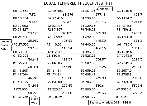 ![]() This table is based upon the A-440 Hz frequency standard. The note letters have a number appended which is their octave number beginning at the bottom octave on the piano. The offset frequencies are the chromatic notes (sharps and flats)