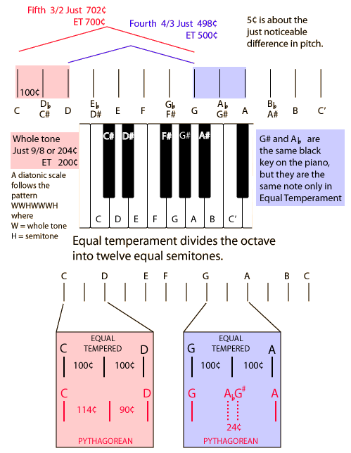 Ideas associated with the equal tempered octaveThe equal tempered scale is the common musical scale used at present, used for the tuning of pianos and other instruments of relatively fixed scale. The middle octave of the piano is illustrated below and used to point to some of the features of equal tempered intervals compared to Just and Pythagorean intervals. ![]() Equal temperament divides the octave into 12 equal semitones. It is common practice to state musical intervals in cents, where 100¢ is defined as one equal tempered semitone. The cents notation provides a useful way to compare intervals in different temperaments and to decide whether those differences are musically significant. A useful parameter for comparison is the just noticeable difference (JND) in pitch which corresponds to about 5¢. If the 5¢ JND in pitch is used as the criterion for acceptable tuning accuracy, then it can be seen that Equal Temperament holds the fifth, the fourth and the whole tone to acceptable accuracy. The breaking of the whole tone into semitones differs significantly from Pythagorean temperament as shown above. The equal tempered major and minor thirds differ significantly from the small whole number ratios of just temperament, and significantly affect the tuning of the major triad.