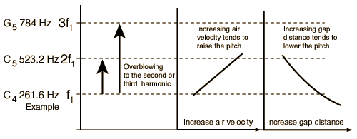 Varying Flute PitchThe lower notes of a flute are obtained by opening holes in the side of the instrument to shorten the air column, raising the fundamental frequency of the open air column. To achieve higher notes, one may force the air column to sound its second harmonic, up an octave from the fundamental. This is achieved by a process called "overblowing" the flute, and the notes produced are said to be in the "upper register" of the flute. Besides those basic ways to vary the pitch of the flute, the player may make "fine tuning" adjustments by control of the air stream from the lips. The pitch can be lowered slightly by aiming the air in a downward direction into the embouchure hole, and raised slightly by aiming the airstream higher so that it crosses over the embouchure hole.