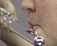 The modern flute was developed by Theobald Boehm who experimented with it from 1832 to 1847, desiring to give it a bigger tone. He finally produced a parabolic (bowl-shaped) head joint attached to a cylindrical body with open-standing keys and finger pads to cover large finger holes. Since then, other minor improvements have been made. The modern flute usually has a range from middle C (C4) upward for about three octaves. In Europe flutes are often constructed of wood; silver is commonly used in the United States. Thanks to Sara Booker for helping to demonstrate the instrument. ![]()