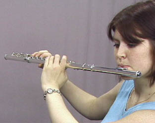 Flute ConstructionThe modern flute is about 26 inches in length with and inside diameter of about 3/4", open at one end . The embouchure at which the edgetone is produced is near one end and constitutes a second open end, making the flute an open cylinder in harmonic content. As with other edgetone instruments, the tone production is made more efficient by the coupling of the slit formed by the players lips, the edge, and the air column. The flute has a series of 16 openings in the tube wall, 11 of which can be closed directly by seven fingers and one by the left thumb. The four additional openings can be opened or closed by means of suitably arranged keys. One advantage of the flute over the recorder is that the player has direct control over the angle at which the air from the lips strikes the embouchure hole. Rolling in or out with the lips relative to the edge gives the player a greater range of volume and expression, and aids the process of overblowing to achieve the higher register. This direct access to the edge also permits the player to make small fine tuning adjustments.