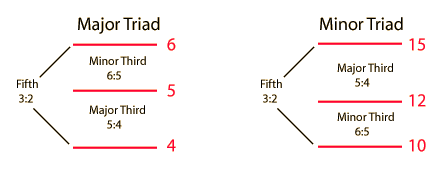 Major and Minor TriadsThe major and minor triads are used widely in western music. In terms of just musical intervals, these triads can be expressed as whole number ratios of frequencies. The actual frequencies vary slightly in other temperaments, but the labeling of the intervals is the same. ![]() Note that the 4th, 5th and 6th harmonics of a harmonic sequence form a major triad: The pitch ratio 4:5:6 is the triad. The minor triad does not fit so neatly in the harmonic sequence, the smallest whole number ratios that produce a minor triad being 10:12:15.
