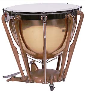 Timpani DetailsThe round head of a timpani can vibrate in a large number of vibrational modes. The fundamental is not generally used in music; it is highly damped and does not produce as pleasing a sound as some other modes. When the head is struck a few inches from the rim, the timpani's fundamental mode is not excited. The player tries to excite the preferred modes 11, 21, 31, 41, 51, 61 . The head is struck about halfway to three quarters of the way out from the center. This is near the nodal line of several of the modes which minimizes their contribution to the sound. The actual sounded frequencies are further affected in a significant way by air damping to finally produce the sequence of frequencies actually heard from the instrument. By contrast, the snare drum is struck in the center and only excites the 01, 02, 03, modes (Sundberg, The Science of Sounds p91) The pedal connects to the lugs which control the tension in the membrane. Early timpani had calfskin heads. Modern timpani heads are usually made of mylar. |
