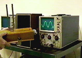 Tuning Fork and OscilloscopeThe tuning fork sound is picked up by the microphone and displayed on the screen of an oscilloscope. Once the fork has settled down to its fundamental mode, it produces a sine wave trace on the oscilloscope. ![]()