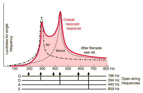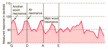 Violin ResonancesBenade's resonance curve for a violin suggests that the main air resonance would enhance the D string and that the main wood resonance would enhance the A string. It should be compared with Hutchins' measurements for a Stradivarius. ![]() Benade's general resonance curve for a violin which is based on Schelleng's calculations, which he states have been verified by experiment. They are not meant to represent a single, specific instrument, as I understand it, but to give a typical behavior. It is interesting to note that the overall resonance curve is not a simple superposition of the air and wood resonances, which is reasonable if variations in phase caused their effects not to consistently add. The air and wood resonances shown are surprisingly sharp.