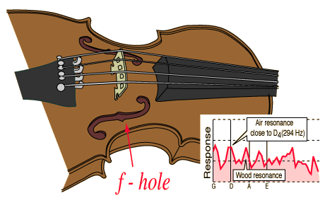 Air Resonance and the f-holesThe f-holes of a violin form the opening of a cavity resonator which in the resonance curve for the Stradivarius shown enhances frequencies close to the open string D4 at 294 Hz. ![]() ![]()