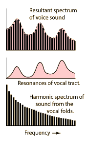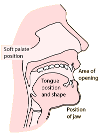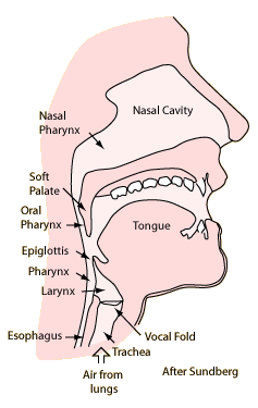 Voice ArticulatorsVoice articulation is seen as the changes in the resonances of the vocal tract, and the agents of such changes can be called articulators. Movement of the tongue, pharynx, palate, jaw, or lips can change the basic factors which determine the frequency of cavity resonance (volume of cavity, area of opening, and port length) . Voice articulation produces sounds which are called vowels, dipthongs, semivowels, and nasals. Such sounds can be considered to be modifications of the basic vocal tract resonance, a kind of filtering of the acoustic spectrum of the voice mechanism. While the resonances for most voiced sounds are in the pharyngeal and oral cavities, the nasal sounds /m/, /n/, and /ng/ require added resonance in the nasal cavity.