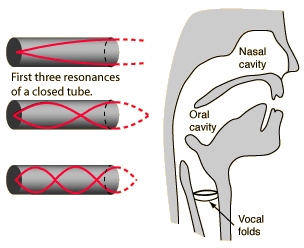 A typical length for the vocal tract is about 17-18 cm. This would give a fundamental frequency of about 500 Hz if it is treated as a closed cylinder. This would predict formant frequencies of 500, 1500 and 2500, which is in the range of observed frequencies. However, the articulators which provide differences in vowel sounds produce significant changes in these formant frequencies. |