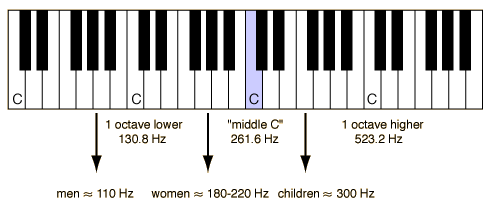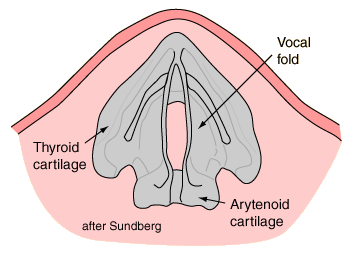 In an adult male, the vocal folds are usually 17-23 mm long, and12.5 -17 mm in an adult female (Kaplan). They may be stretched 3 or 4 mm by action of the muscles in the larynx. The male speaking voice averages about 125 Hz, while the female voice averages about 210 Hz. Children's voices average over 300 Hz. The illustration below shows approximate pitches for speaking voices related to an equal tempered piano keyboard based on A4 = 440 Hz. ![]() The front end of the vocal folds is attached to the thyroid cartilage, the "Adam's apple". The back end is attached to the arytenoid cartilages, which move to separate the folds for breathing. |