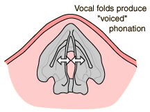 Vocal Folds in PhonationThe process of converting the air pressure from the lungs into audible vibrations is called phonation. When the air passes through the elastic vocal folds and causes them to vibrate, the type of phonation is called voicing. The vocal folds give the singer a wide range of control over the pitch of the sound produced. While "vocal folds" is more descriptive than "vocal cords", there is some similarity to a vibrating string in that the pitch produced depends upon the length, mass and tension of the vocal folds.