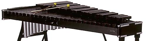Xylophone and Marimba![]() The Marimba's bars are tuned by cutting up on the underside of the bar. The normal free bar modes are not a harmonic sequence, but they can be altered by removing material. They are tuned so that the first overtone is the fourth harmonic. The length of bar required for a given frequency is also diminished by the cutting process. The tubes underneath are tuned to the fundamental of the bar. For a xylophone (shown above) the bars have a shallower underside cut and the first overtone is tuned to the third harmonic of the fundamental. Closed resonance tubes reinforce both these frequencies if they are tuned to the fundamental. The playing range of a concert marimba is A2 to C7 (110 to 2093 Hz) and bass marimbas extend down to C2 (65 Hz). The undercutting of the bars on the marimba produce overtones which are described as two octaves up, and then three octaves plus a minor third. Two octaves is the fourth harmonic, and the other overtone is close to the 10th harmonic (48/5 if just intervals are used). These upper resonances are not reinforced by the closed tube resonator since it produces only odd harmonics. For a xylophone a typical playing range is F3 to C8(349 - 4186Hz), this top note being the same as the top note on a piano. It has narrower and thicker bars than the marimba, contributing to a higher wave velocity and higher pitch for a given length than for the marimba. The xylophone has a sharp, bright sound which is attributed to the thick, stiff bars and the presence of the reinforced first overtone. |